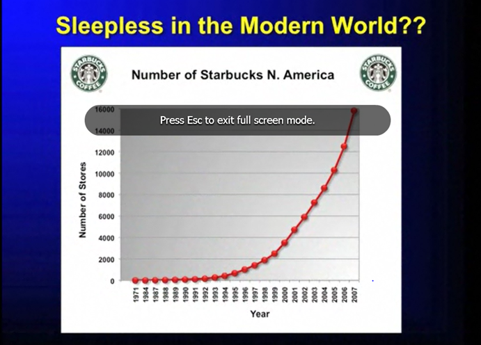 Here’s a chart by Professor Matt Walker ilustrating sleeplessness in the modern world by plotting data from The Financial Times, a proxy for caffeine consumption -the increase over two decades in the number of coffee houses of just one popular chain…