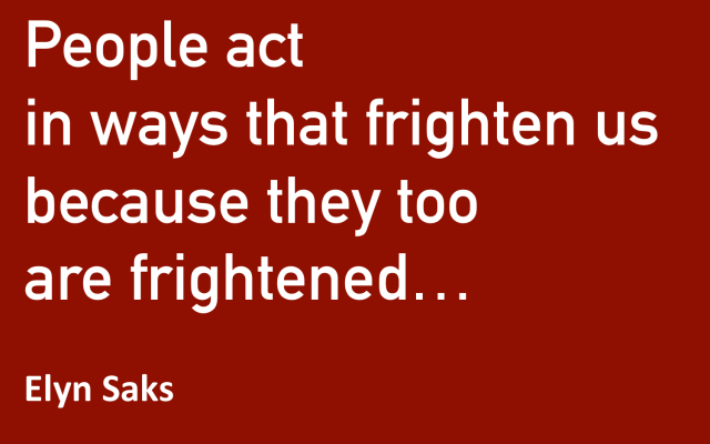 We humans are mammals – and when we are distressed we can act in way s that seem strange, even threatening to other mammals [humans]. As Elyn Saks, Professor of PSychiatry and Law, says..