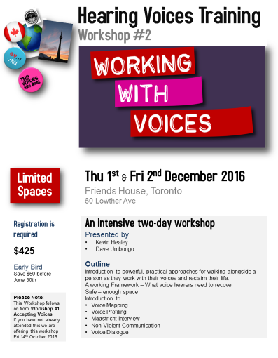 This workshop follows on from Workshop #1 Accepting Voices which provides a foundation for this work. If you have not already attended this we are offering it Fri 14th October 2016.