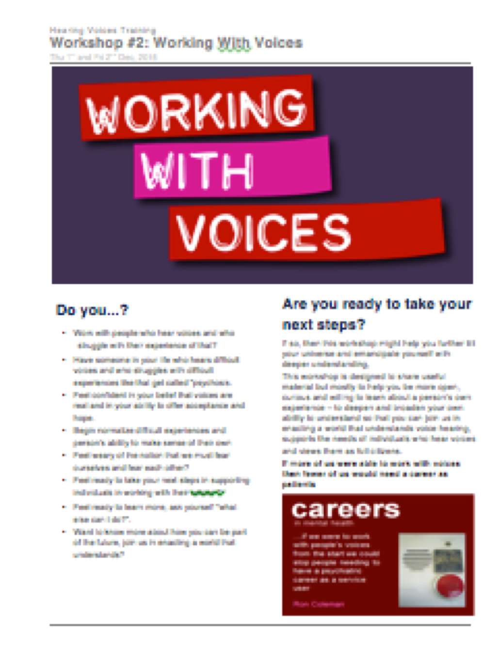- In the end this workshop is designed to share useful material but mostly to help you be more open, curious and willing to learn about a person’s own experience – to deepen and broaden your own ability to understand so that you can join us in enacting a world that understands voice hearing, supports the needs of individuals who hear voices and views them as full citizens.