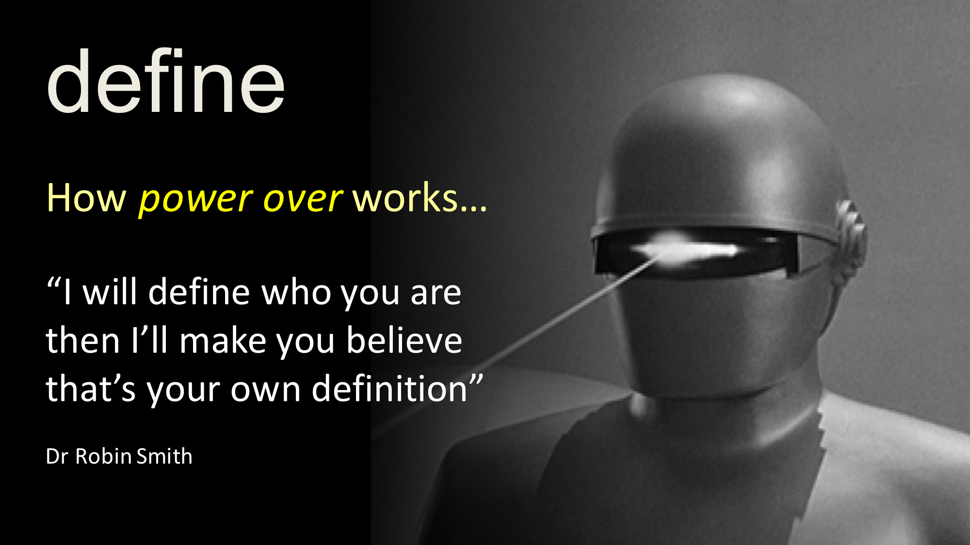 Often though it’s much less obvious, here’s one example of how power over is exercised subtly yet with great impact. Acting to define another’s experience is, definitively, a definition-in-action of using power as power-over them.
