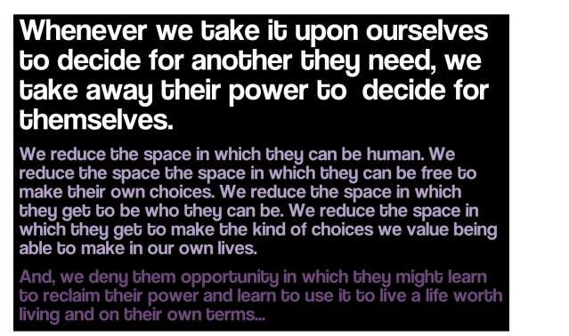 And, we deny them opportunity in which they might learn to reclaim their power and learn to use it to live a life worth living and on their own terms…