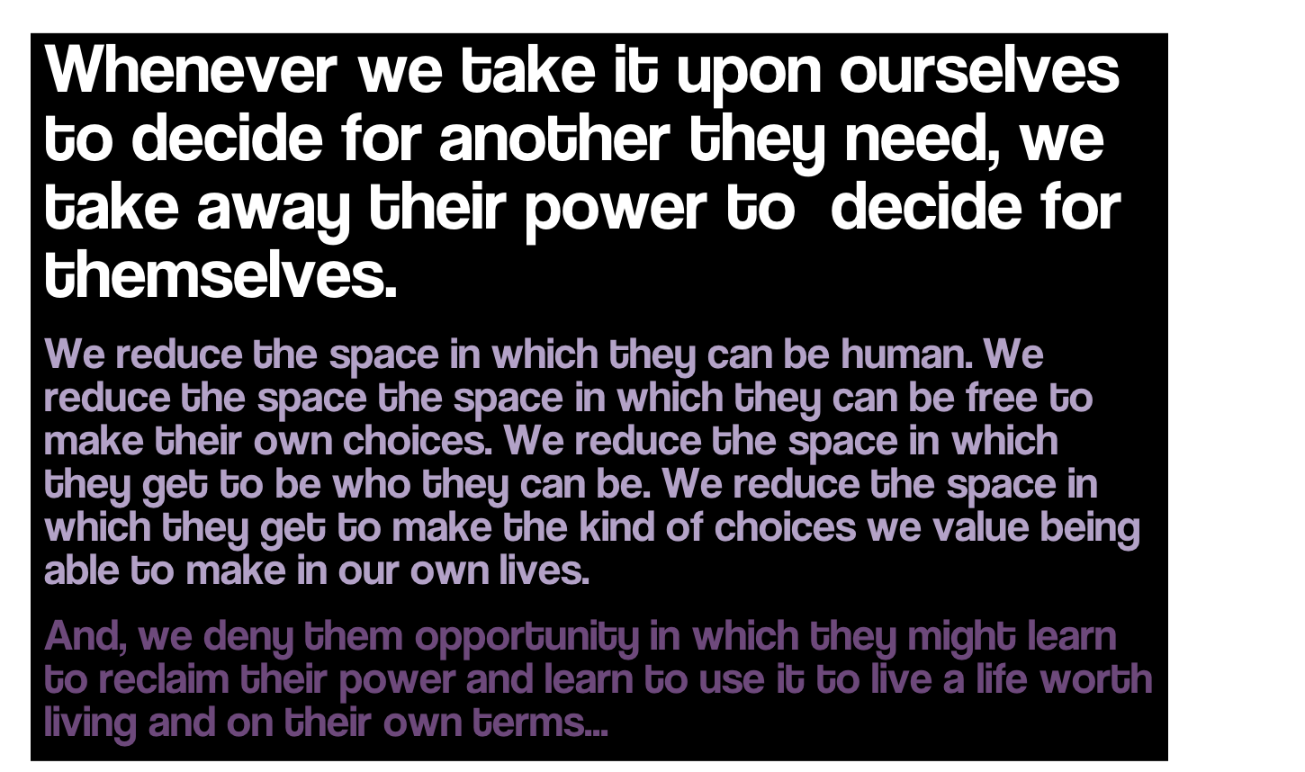 And, we deny them opportunity in which they might learn to reclaim their power and learn to use it to live a life worth living and on their own terms…